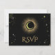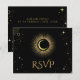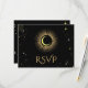 Celestial mystical personalized wedding response card featuring galaxy milky way midnight sky with star dust, crescent moon and other astrological symbols in black and golden colours. This card is easily editable. If you need help with the customization of this card or you need more matching products for this collection kindly message me via Zazzle.