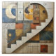 This unique ceramic tile captures the essence of cosmic balance through a geometric mosaic that marries abstract art with celestial themes. It is a harmonious blend of earth tones and celestial blues, featuring sandy beige, terracotta orange, deep space blue, and golden yellow. The intricate crackling effect on each tile adds an antique charm, evoking the grandeur of Renaissance frescoes with a modern twist. Squares and circles intersect and overlap, creating a visual representation of celestial bodies in motion. This piece is not just a tile; it's a conversation starter, perfect for adding an intellectual and artistic flair to any room. Inspired by the precision of geometry and the vastness of the cosmos, this tile is a must-have for those who appreciate art that speaks of the universe and its mysteries.