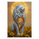 Behold a majestic, stylized white lion, crafted in an intricate, layered papercraft or sculpted style, standing proudly amidst a vibrant field of tall yellow sunflowers. Its flowing mane whirls dynamically, capturing movement and power, while piercing yellow or orange eyes convey intensity and strength. The lion’s torso, or a significant portion of its body, is dramatically cracked or split open, revealing a stunning internal cityscape nestled within—a gleaming, futuristic metropolis of towering skyscrapers, complex geometric structures, and glowing light trails, reminiscent of a planet’s core exposed through a celestial fracture. Behind the lion, a luminous orange sun or abstract celestial disk dominates the sky, gradually transitioning into a starry cosmic expanse at the upper edges, enhancing the mystical and otherworldly atmosphere. The overall aesthetic masterfully blends organic, spiritual naturalism—embodied in the lion and sunflower field—with sleek, high-tech futurism showcased in the glowing city inside the lion. Highly detailed and symbolic, this scene creates a striking contrast between the warm, natural exterior and the cool, luminous interior, evoking themes of inner strength, discovery, and cosmic wonder.