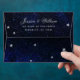 An elegant envelope recommended for a celestial wedding. On both sides it has a dark blue starry night sky with (faux) silver moon and stars. The return address is printed on the flap, the names in an elegant calligraphic script.