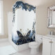 This decorative shower curtain features a celestial theme in shades of navy blue and gold. The top and bottom borders feature a celestial night sky scene with stars and a crescent moon. A majestic moth is pictured at the bottom, accents with gold and blue flowers.
