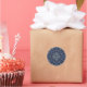 A lace-like concentric circle mandala in light blue with bright blue and gold star-like dots spangled among the layers makes for a fun, design that brings to mind a starry night sky.