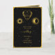 A mystical celestial monogram wedding design in black and gold. A simple tarot style design that uses a sky stars background with a gold crescent moon, celestial sun and matching heart monogram . An elegant black and gold celestial design with classy script typography. A modern tarot themed wedding order of service design with modern elements. Matching wedding invitations and other stationery items are also available.