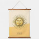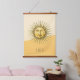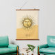 Wood topped wall tapestry features celestial Sun face with geometric colorblock background and customizable goldish brown text for monogram