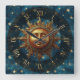 Amid a starry celestial background, the serene face of a stylized golden sun.