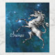 Beautiful vintage heraldry style unicorn illustration set on celestial skies background. Customize with name or other text in white script font.