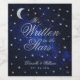 For a celestial wedding with the theme "It's Written in the Stars". The text is surrounded by  the moon and star on a starry night blue background.