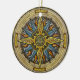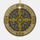 An elaborate compass made of Celtic knotwork, printed in silver and copper metallic colour accents on the face and corners as well. Degrees are marked off from 10-90 in each quadrant. Around the compass, all four cardinal points are labelled in engraved-looking Irish-Gaelic on brass colour plates, subpoints are labelled in Irish-Gaelic, and twelve elemental points as well: earth, storm, lightning, metal, air, sun, wind, wood, water, fire, spirit, stone. Also, subtle, decorative rune work decorates an inner ring.
