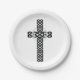 A set of white paper plates with a Celtic Cross made up of a black cross and white ring, both in Celtic knot designs.