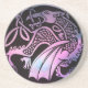 Round coaster features Celtic dragon symbol with tones of purples and blues