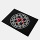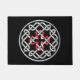 A black door mat with a Celtic knot design with a red square cross in the centre.
