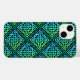 An iPhone 14 Case with a blue-green Celtic knot repeated tile pattern against a black background. Not an iPhone 14? No worries, it's also available for other device types =)
