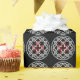 A wrapper with a pattern of a Celtic knot design with a red square cross in the centre.