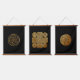 A set if three intricate celtic knotwork designs, a Celtic Knotwork Cross, and Triple Celtic Swirld Knotwork Mandalas with eternal spirals and trinity knots , in gold and black on an ancient parchment.