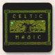 Surrounded by a border of celtic knots, a stylized, mystical forest and riders in tones of green.