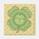 This classic four leaf clover overlays a concentric circle design featuring layers of Celtic weaves in multiple shades of green with a bit of orange for accent.
