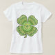 This classic four leaf clover overlays a concentric circle design featuring layers of Celtic weaves in multiple shades of green with a bit of orange for accent.
