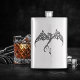 The product is a good size and came exactly as it was pictured. The lid is not attached to the flask, which could be dangerous on drunken nights... The print came out surprisingly well and looks very sharp. Would definitely recommend.