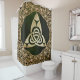 Celtic Trinity knot framed with floral filigree on a dark forest background.
