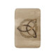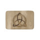 A bath mat featuring a simple coloured Celtic triquetra interlaced with a circle forming a trinitarian symbol against a wood background, representing spiritual unity with the divine.