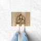 A door mat featuring a simple colored Celtic triquetra interlaced with a circle forming a trinitarian symbol against a wood background, representing spiritual unity with the divine.