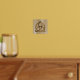 A foil print featuring a simple coloured Celtic triquetra interlaced with a circle forming a trinitarian symbol against a wood background, representing spiritual unity with the divine.
