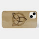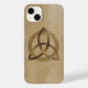 Un Coque iPhone 14 Plus avec un simple triquetra celtique couleur entrelacé d'un cercle formant un symbole trinitaire contre un arrière - plan en bois, représentant l'unité spirituelle avec le divin.