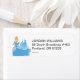Cendrillon dans sa robe bleue avec la silhouette du château en arrière - plan.