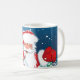 Holiday winter ceramic coffee mug shown with a cute festive Santa & Frosty print.