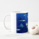 Ceramic coffee mug shown with a photo print of sharks in the deep sea. Customize this item or buy as is. Stock Image
