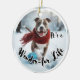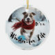 This ceramic ornament features a Pitbull having fun playing in the snow. The print on the ornament claiming that this pup chasing a ball in the snow is living a "Wonder 'fur' Life". Ornament is 2.87 inches, round and made of ceramic, comes with a hanging thread. This is a delightful addition to your family tree decor.