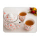 Ceramic tea set with floral pattern, and freesia flowers out of focus in the background.