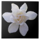 This stunning bloom is the Cape Jasmine Gardenia. There are a number of different gardenia varieties. This one is distinctive for the initial unfurling of the (usually six) outer petals, followed by a rose-like interior bloom. Gardenias have a wonderful, faintly spicy fragrance that makes it a popular choice for perfume makers. Thought to be named after Alexander Garden, a Charleston, South Carolina, physician, gardenias have also become associated with the South. Once quite popular in wedding bouquets, the flower is now infrequently used in bouquets because of their sensitive nature. You have to be very careful with the care and handling of these blooms. If the bloom is handled too much the petals will turn black. This spectacular bloom is offered here on a black backdrop for a truly striking design. You are, however, welcome to change the background colour to better suit your personality or personal sense of style. This gorgeous tile makes an excellent trivet, coaster or accent tile in the kitchen or bath.