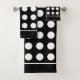 Ensemble de serviettes de bain élégant moderne et stylé avec des cercles blancs sur fond noir.