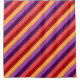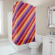 Un rideau de douche avec un motif motif coloré de rayures diagonales en rouge cerise, rose melon, violet, violet prune et jaune banane.