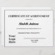 Il s'agit d'un prix modèle pour un certificat de réussite. Il contient du texte que vous pouvez modifier pour afficher le nom du destinataire dans un script élégant. Vous pouvez également modifier l'autre texte pour customiser le prix pour votre occasion et votre organisation. Il y a une ligne pour la personne qui donne le prix à signer. Vous pouvez également faire imprimer le nom et le titre de cette personne sous la ligne. Une image d'affichage se trouve en bas, que vous pouvez remplacer par le logo de votre organisation. Le papier est blanc. Le texte est noir.