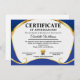 This elegant Certificate of Appreciation features a professional blue and gold design, perfect for recognizing achievements, dedication, and years of service. Ideal for businesses, schools, organizations, and institutions honoring employees, teachers, or staff. Fully customizable with recipient name, organization, date, and signature. A timeless and formal award for recognition ceremonies, corporate events, and academic achievements.