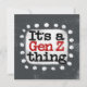 "It's A Gen Z Thing" est un design de texte mignon en gris avec du texte en noir et rouge, avec une forme d'accent blanc et des points blancs texturés blancs qui l'entourent.
