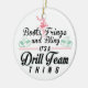 Une fille de couleur corallienne en uniforme d'équipe de perceuse classique pose au sommet du dessin en déclarant Boot, Fringe et Bling dans une police de script noir. Autour des mots 'et bling' sont une paire de poèmes couleur menthe, avec un casquette et une botte. Les lignes de corail séparent le haut et le bas du dessin. Le fond de la conception indique qu'il s'agit d'une tâche d'équipe de forage en noir avec l'ombrage à la menthe sur le mot Équipe de forage.