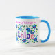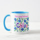 Une tasse blanche avec une jante et une poignée bleues en poudre, décorée d'un collage de papier peint à la main fleuri et les mots "Cette Mug appartient au Chloe". Lave-vaisselle et micro-ondes.