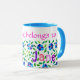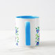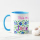 Une tasse blanche avec une jante et une poignée bleues en poudre, décorée d'un collage de papier peint à la main fleuri et les mots "Cette Mug appartient à Jane". Lave-vaisselle et micro-ondes.