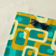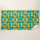 This beach towel has a mid-century modern design of rounded rectangles with ovals inside in retro colours of turquoise, teal, off-white, and gold. If you want the same design with different colours, message me.