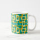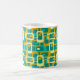 This mug has a mid-century modern design of rounded rectangles with ovals inside in retro colours of turquoise, teal, off-white, and gold. If you want the same design with different colours, message me.