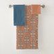 Ce kit de serviettes est muni d'un linge de toilette rouille, d'une serviette bleue en ardoise et d'une serviette de bain au design art déco de trois ovales saumons, réparties sur deux rectangles saumons très minces avec des lignes bleu ardoise sur un champ de rouille. Voulez-vous le même design avec des couleurs différentes? Message-moi.