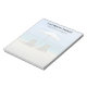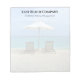 Blank notepad with two lines of custom text at the top and beach chairs background. Two chairs face the turquoise ocean beneath an umbrella in this background image. Use the lines of text, or delete the sample wording. This design would work well for a travel business, coastal company, or vacation rentals.