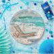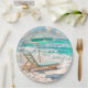 A serene beach scene features a striped lounge chair and umbrella set against a backdrop of turquoise waves and fluffy white clouds