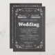 This design features a faux chalkboard background with fancy scrolls and hearts. Unique typography that reads: "Eat, Drink and be Married". The reverse side of this popular wedding invitations has the same themed chalkboard and scroll work with plenty of customizable text for you to add your wedding information. We have matching stamps, RSVP and Thank You cards for this design!