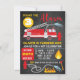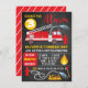 Bold chalkboard fire truck birthday invitation for a little boy featuring a fire engine, fire hydrant, fire hose and ax. Suitable for anyone who likes chalkboard invitations and great for a fire truck themed birthday party. Same design is also available with a photo at the store.