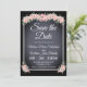 Chalkboard Floral Black Wedding Save the Dates. Pretty black chalkboard wedding save the dates with white text on a black chalkboard on a black background adorned with a digitally adjusted print of hand-painted watercolor floral arrangement in shades of pink, coral, green, dusty blue and grey-blue. Personalize with your wedding details. Back is shown in solid black however you may customize it to any colour or add your own photo/s using the tools provided within Zazzle's personalize and customization menus. Please visit our store, Austen & Grace, to view our full range of products and please contact us if you require extra matching products or any assistance via the contact button or email directly at contact@austenandgrace.com