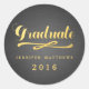 Stickers Black Chalkboard et Gold Graduation Round. Design par Elke Clarke © Visitez notre boutique www.zazzle.com/monogramgallery* pour plus de design et de styles. Une simple typographie de feuille d'or manuscrite écriture de police texte superposition (effet photo imprimé) avec le mot "Graduate". Ajoutez votre nom de diplômé et votre année de graduation. Parfait pour les scellés d'enveloppe sur vos annonces de remise de diplômes ou les invitations à une fête de remise de diplômes.